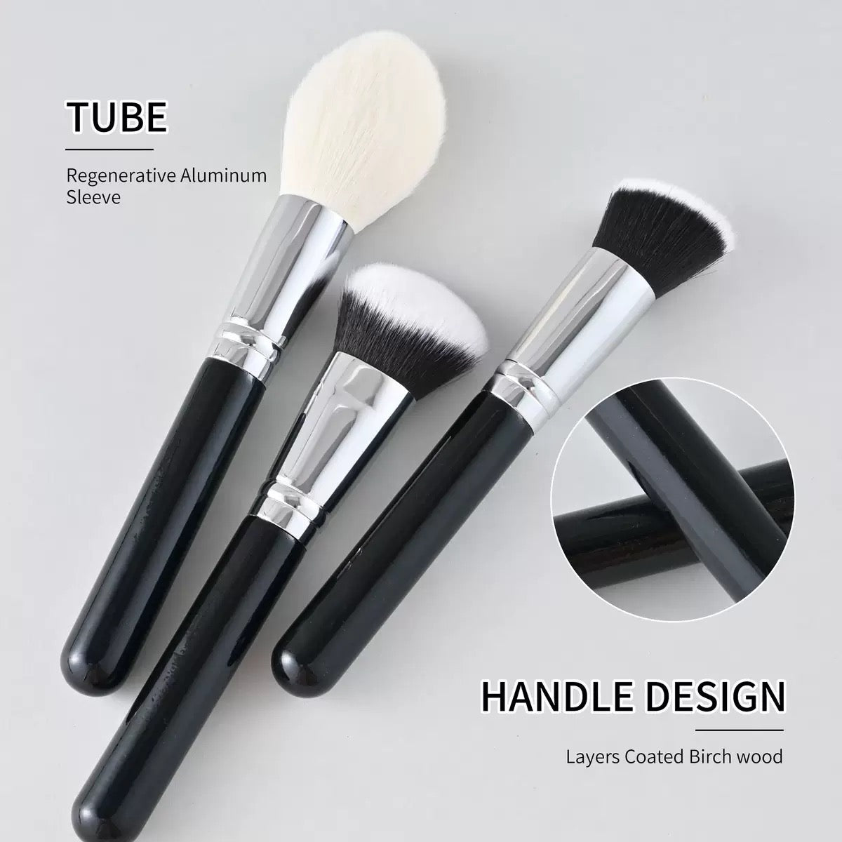 The aluminum ferrule provides enhanced durability and corrosion resistance, while the layer-coated birch wood handles offer a balanced grip, lightweight comfort, and professional control — perfect for both makeup beginners and seasoned artists.